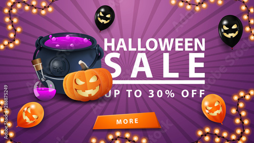 Halloween sale, up to 50% off, purple discount banner with witch's cauldron with potion