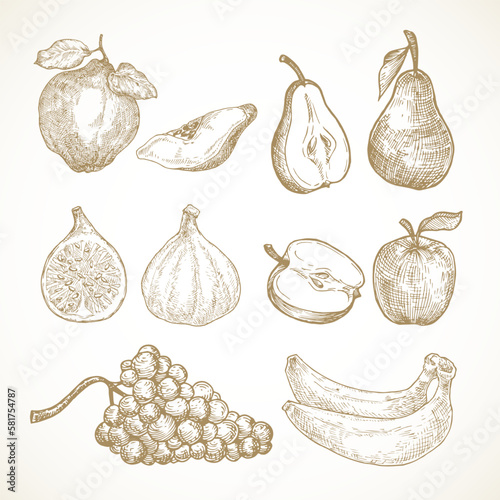 Set of fruit graphics hand-drawing, pear apple plum. Imprint, stamp, isolated, on a white background. Vector illustration