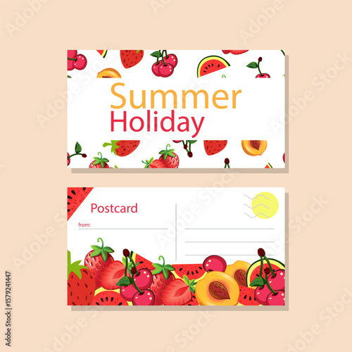 Summer sales ticket with images of cherries, peaches, strawberries and watermelons. Attractive design offering discounts.