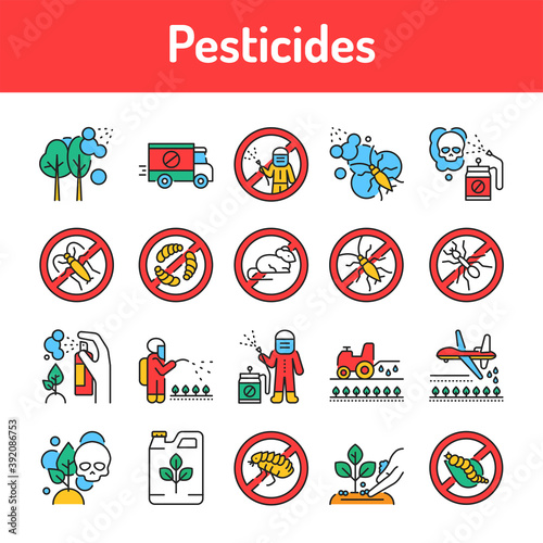 Pesticide free packaging warn information stamp badge watermark green seal emblem guarantee protection safe pest control risk chemical health icon set design collection