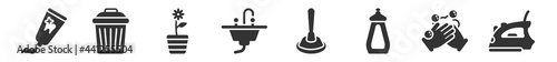 Set Cooking pot, Dishwashing liquid bottle, Rubber plunger and Antibacterial soap icon with long shadow. Vector
