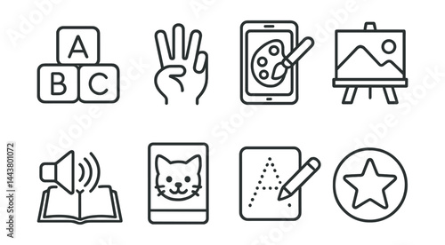 Line vector icons of kids learning apps: alphabet block, counting fingers, colors game, drawing board, voice reading, animal flashcard, letter tracing, reward star.