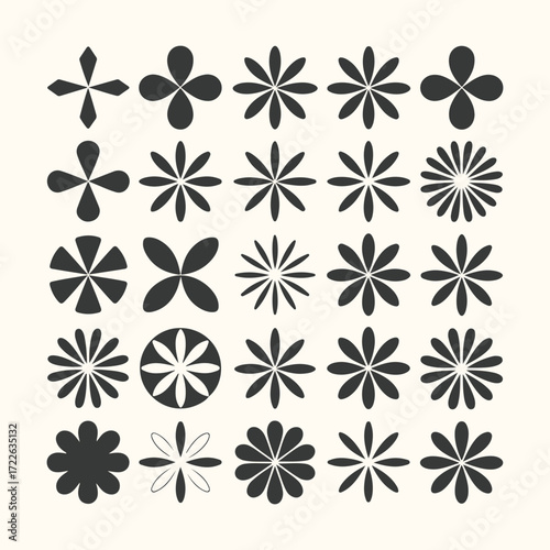 Modern minimalist flower icons for logos and branding, various petal counts and compositions