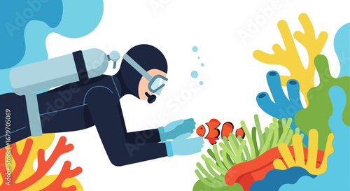 Diver Exploring Underwater World With Coral Reefs, Minimalist Artistic Illustration