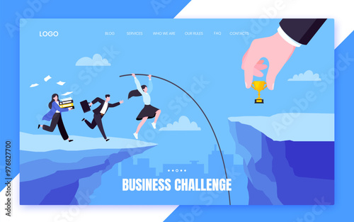 Business people runs and jumps pole vault over abyss flat style design vector illustration business concept. Business growth and goal achievement concept.