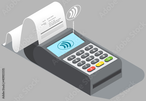 Pos terminal printing paper receipt illustration featuring a point of sale machine generating a bill