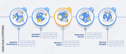 Energy drinks cognitive effects vector infographic template. Attention, speed presentation design elements. Data visualization with 5 steps. Process timeline chart. Workflow layout with linear icons