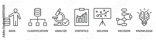 Data science banner web icon vector illustration concept with icon of data, classification, analyze, statistics, solving, decision and knowledge