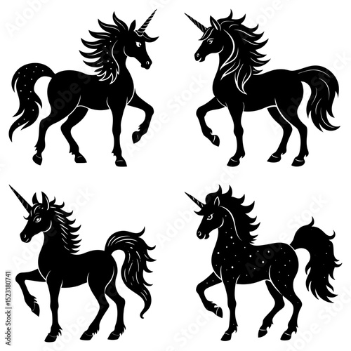 Silhouette of a black unicorn prancing with a flowing mane and tail on a white background design art