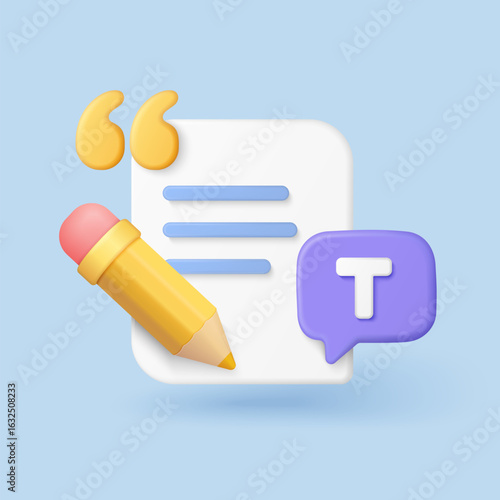 Creative 3d copywriting icon showing pencil, document, and text bubble for content creation, marketing, or writing services on isolated blue background vector illustration