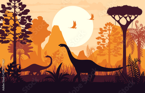 Prehistoric dinosaurs silhouettes at volcano landscape in Jurassic era forest, vector background. Giant lizards and dinosaur reptile silhouettes in jungle with volcano eruption for paleontology museum