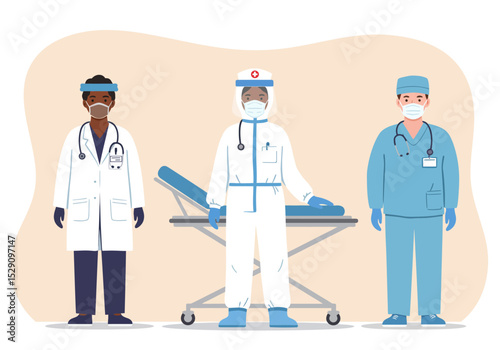 Illustration of two male doctors in protective suits holding a clipboard, with medical staff in uniform standing together against a white background, and emergency aid workers in safety clothing