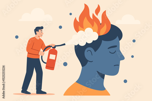 Conceptual illustration: Man extinguishing fire on human head, metaphor for mental health support, stress management, burnout prevention, therapy, overcoming anxiety and depression.