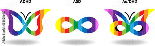 Neurodivergent ADHD, ASD, and AuDHD brain symbols. Colorful illustrations of mental health awareness, identity and inclusion in neurodiversity spectrum.