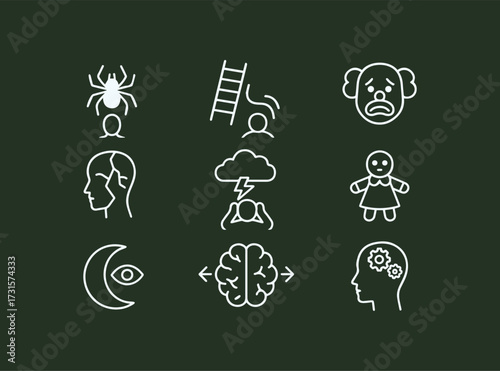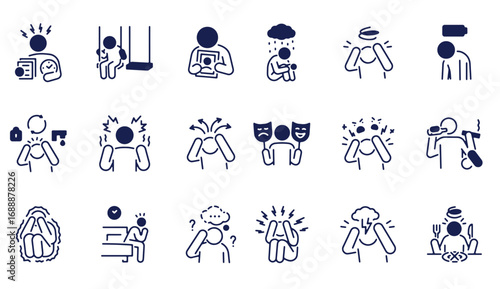 A collection of minimalist line art icons depicting various mental health conditions and psychological concepts