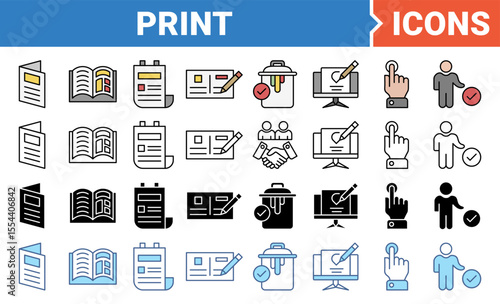 Publishing Outline icon. Flyer Brochure line icon set. letterhead, booklet, leaflet, corporate catalog, envelope.