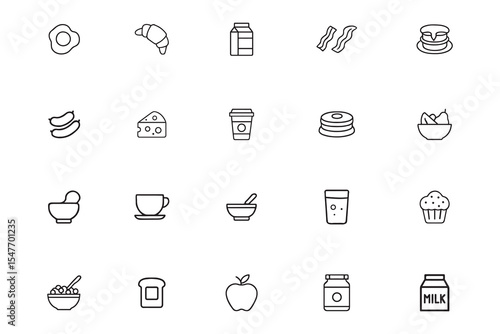 A set of minimalist black and white line art icons depicting classic breakfast food items like a fried egg, toast, milk, butter, and a jam jar in a simple graphic style