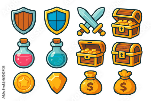 Game icon set for fantasy RPG. Vector assets for UI design. Cartoon shield, sword, magic potion, treasure chest, gold coin, gem, money bag. Mobile game resources elements.