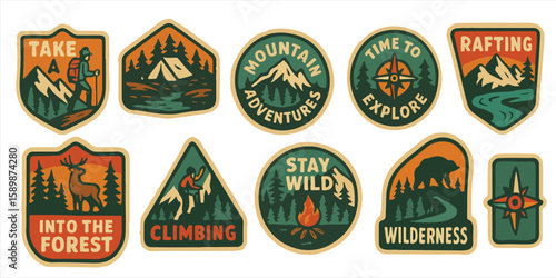set of vector camping, hiking, caving and rafting emblems labels