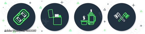 Set line Compass, Rafting boat, Wooden axe and Canteen water bottle icon. Vector