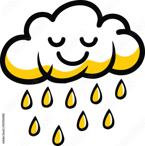 Whimsical depiction of a gloomy cloud with radiating light raining with a joyful raindrop face