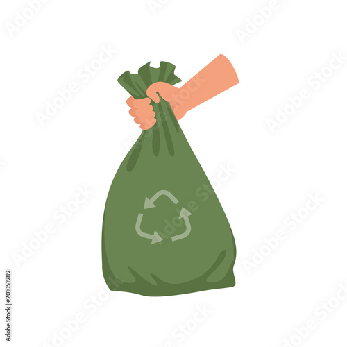 Human hand holding eco bags for grocery products, zero waste packet for food vector illustration