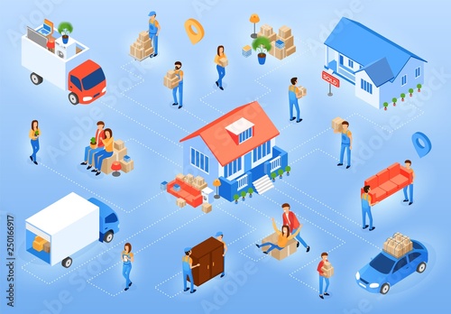 Moving isometric vector illustration. Neighborhood in a small town, home, park, people, delivery track. Transportation automobile for relocation, delivery isometric pack