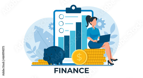 Finance Savings Concept, young woman study financial management, Family couple saving money, girl putting money or coins into a piggy bank. set flat vector modern illustration