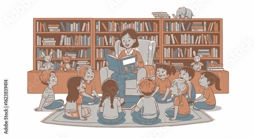 A woman reads a book to a group of children sitting in a circle on a rug in front of a bookshelf filled with books and toys.
