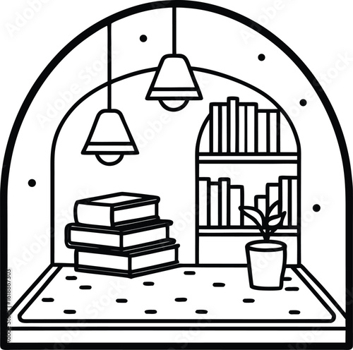 Elegant monochrome sketch of a cozy interior showcasing plants, furniture, and a decorative rug enhancing the scene