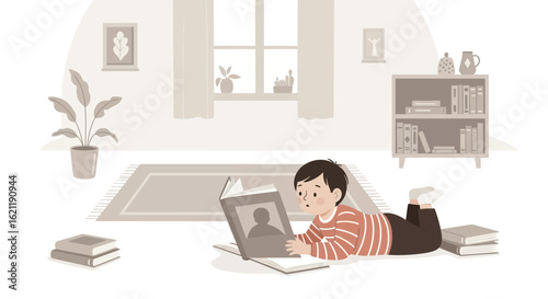 Engrossed Boy Reading A Book Lying On Rug In Living Room Interior
