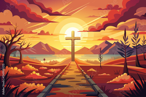 vector of Path to hope and salvation leading to the cross at sunset
