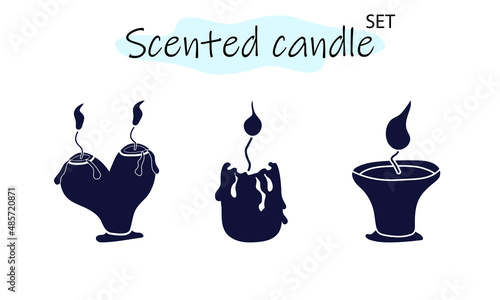 A set of scented candles with a burning fire. Candles for interior, lighting and romantic dates. Aromatherapy. Vector illustration in solid monochrome design on a white background.