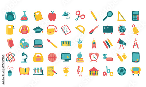 Colorful school icon set. Modern flat education cartoon collection, fun study geometric element bundle. Children stationery texture, art supplies symbol design.