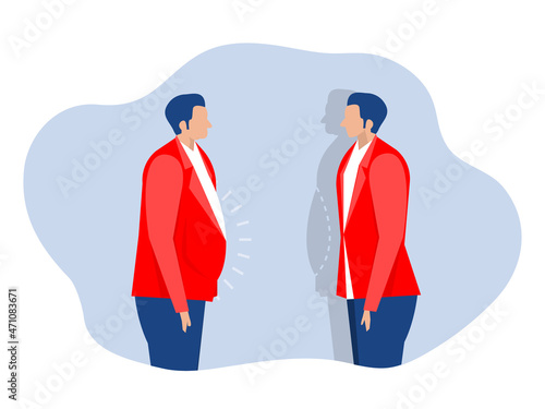Woman standing in front of a mirror, seeing a distorted and larger reflection makes her concerned. Flat vector illustration isolated on white background