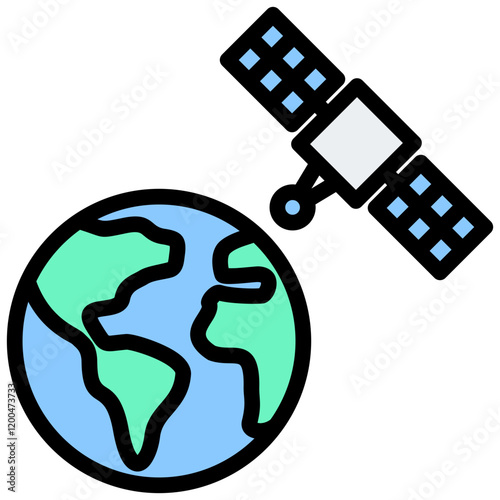 Solid style icons of satellite geolocation tools: satellite icon, orbit path, geo marker, imaging tool, cloud layer, remote sensing icon, earth scan, satellite signal.