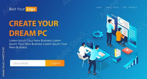Isometric seo optimization. Website team computer optimizing. 3d seo web site optimize vector illustration