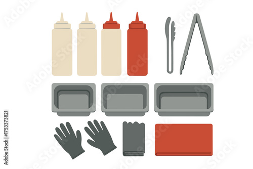 Set of kitchenware and dining accessories: cooking pots, serving ladles, napkins, and blank place cards