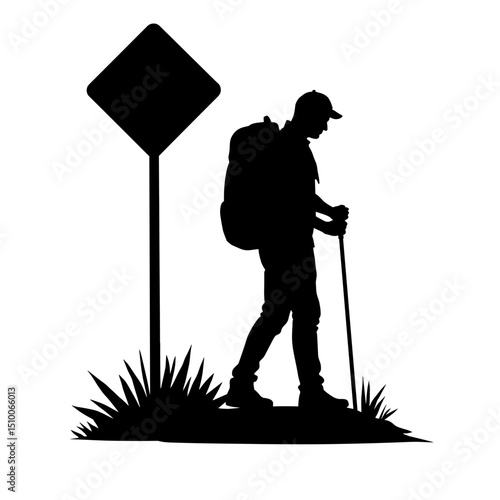 Silhouette of hiker with backpack near roadside sign, black and white travel adventure
