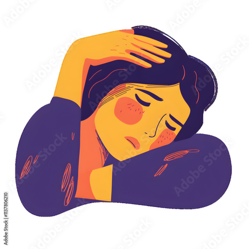 Illustration of young woman lying in bed, holding her forehead, looking unwell and tired, illustration