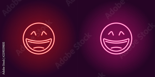 Laugh now neon sign. Happy emoji on brick background. Happiness, joke, humor. Night bright advertisement. Vector illustration in neon style for emotion, entertainment, attitude