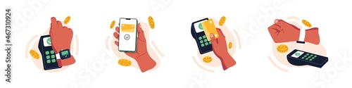 Vector set of contactless payment flat icons. Contains icons terminal, payment, receipt, credit card, NFC, cashless payment, electronic receipt and more. Pixel perfect.