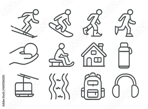 Winter sports icon set. Collection of linear icons for winter activities and recreation. Includes snowboard, ski poles, ice skates, sled, snowshoes, and helmet vector.