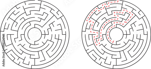 Circular maze illustration unsolved and solved featuring pathfinding solutions for problem solving concepts