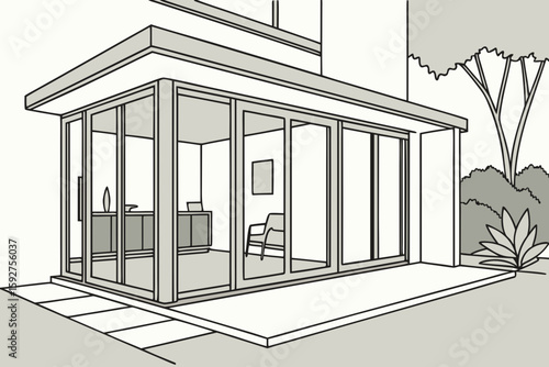Illustration of a spacious living room with large windows and a view of a garden and furniture