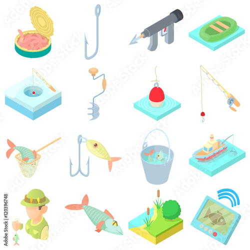 Fishing icons set in cartoon style. Fisher equipment set collection vector illustration
