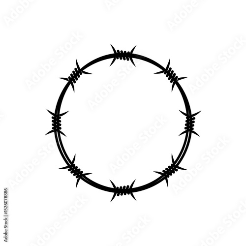 A vector silhouette of a barbed wire fence with sharp barbs and a metal coil represents a barrier of protection and a symbol of security, isolated against the sky