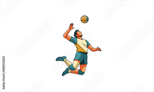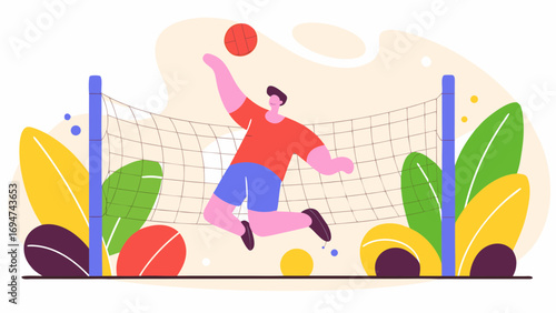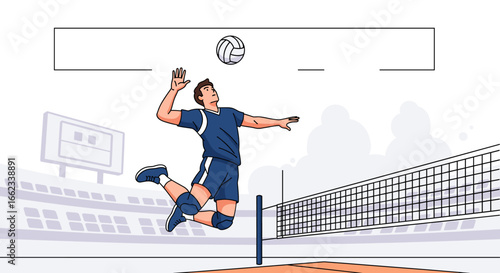 Dynamic illustration of a male volleyball player jumping high to spike the ball against an explosive, abstract background.