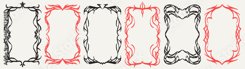 Decorative gothic frame set with tribal ornaments and black silhouettes on light background for tattoo or medieval designs. Sharp curved borders with flame elements. Fantasy embellishment shapes.