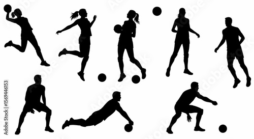 Silhouetted Volleyball Players in Action, Black Figures on White Background